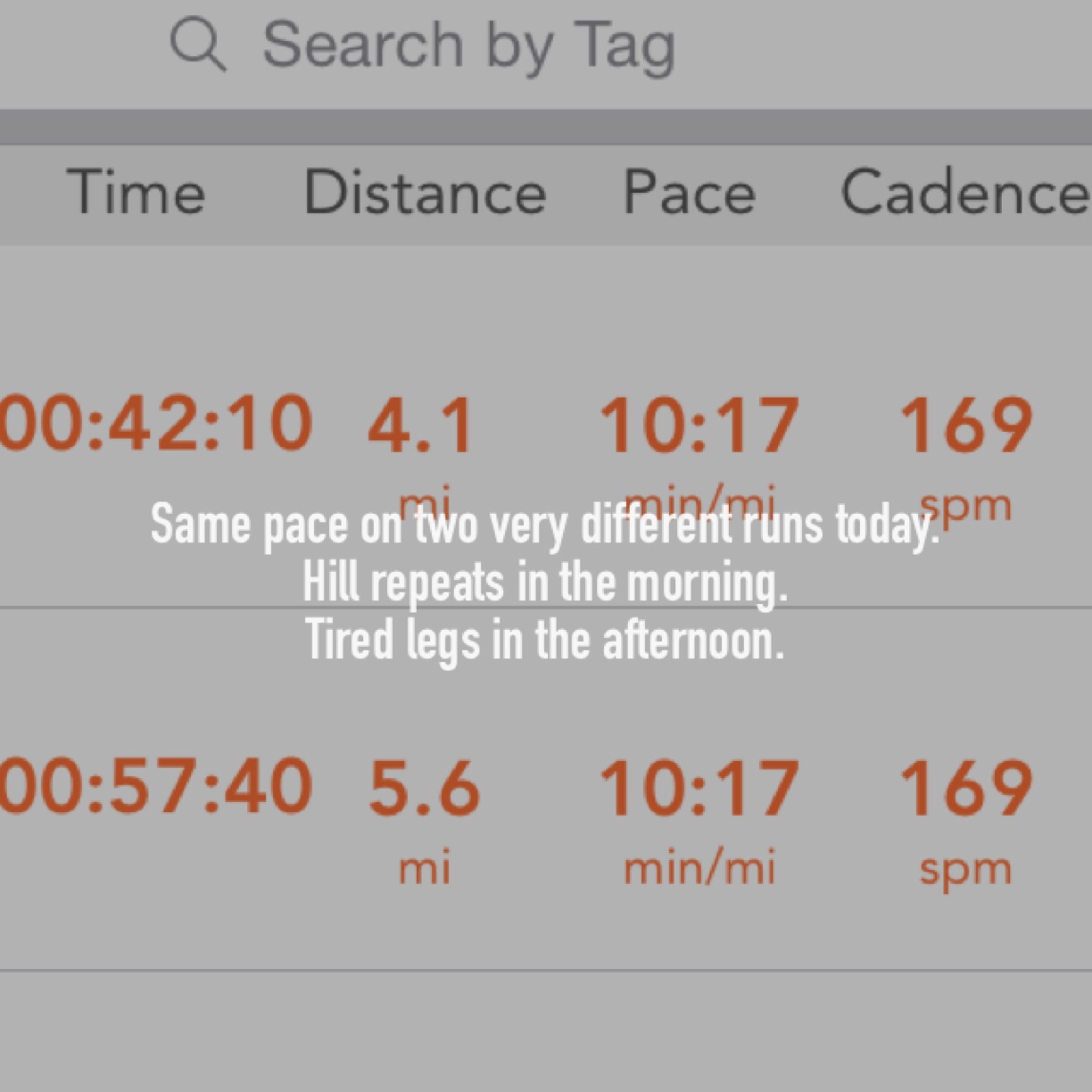 The run right below it was my morning hill repeats run. I thought it was interesting that the average pace over both runs was the same.