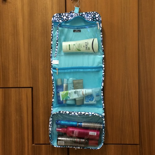 1. Toiletries Bag. It took me a while to get into a groove with a shower-at-the-gym routine, and this hanging toiletries bag that I got for about $15 at Wal-Mart was one of the last pieces of the puzzle. It holds all of my full-sized toiletries, keeps everything organized, hangs up on a locker hook for easy use, and rolls up to fit compactly in my gym bag.