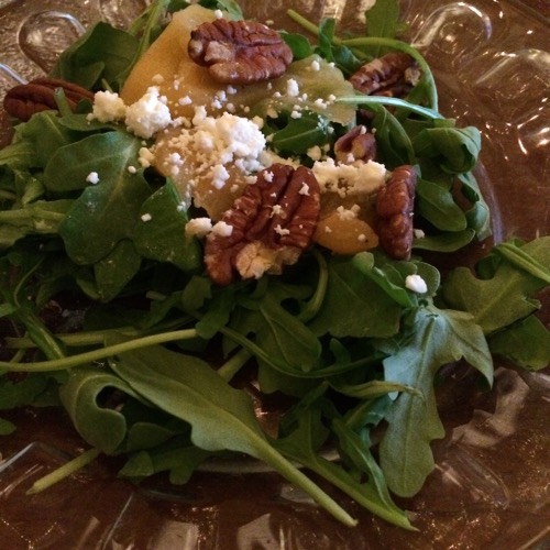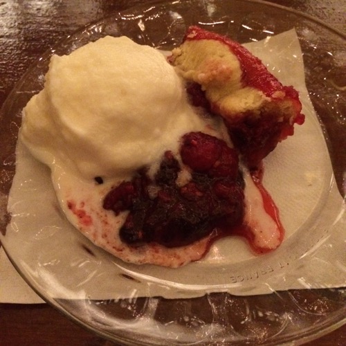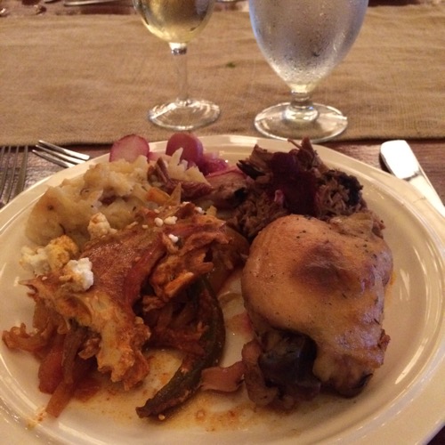 Appetizers included “farm crudites,” skewers of watermelon/mint/brie, and ceviche. Dinner started with salad, then we helped ourselves to a buffet with chicken, beef and vegetarian options (as you can see I tried them all!), and dessert of homemade berry pie topped with just-made ice cream!